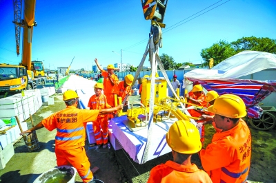 在南中軸路(珠市口-天橋)道路大修改造工程現場,北京市政路橋養護集團工人在吊裝御道石板。武亦彬攝