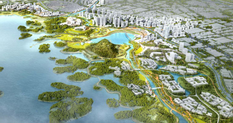 東莞松山湖南岸創意交融之城,是華為的數據中心。在設計時,希望供應商、產業鏈條、活動能夠引發出周邊的效益。因此將整個區域聯絡起來,包括整個的區域規劃,希望能夠帶動周邊的網絡體系和一些住宅、城市的發展。園區的整體規劃,一方面把綠地做成隔離帶作用,將每個園區隱身;另一方面,將園區能夠和旅游供應商以及城市發展結合在一起。在濱湖區域他們做了互動的鏈條,使得科技工作者、研發員工能夠互相交流。在城市發展的過程中城市設計師不得不面對一些很現實的挑戰,要使用現有的條件將它們編織起來變成更美好的生活環境。