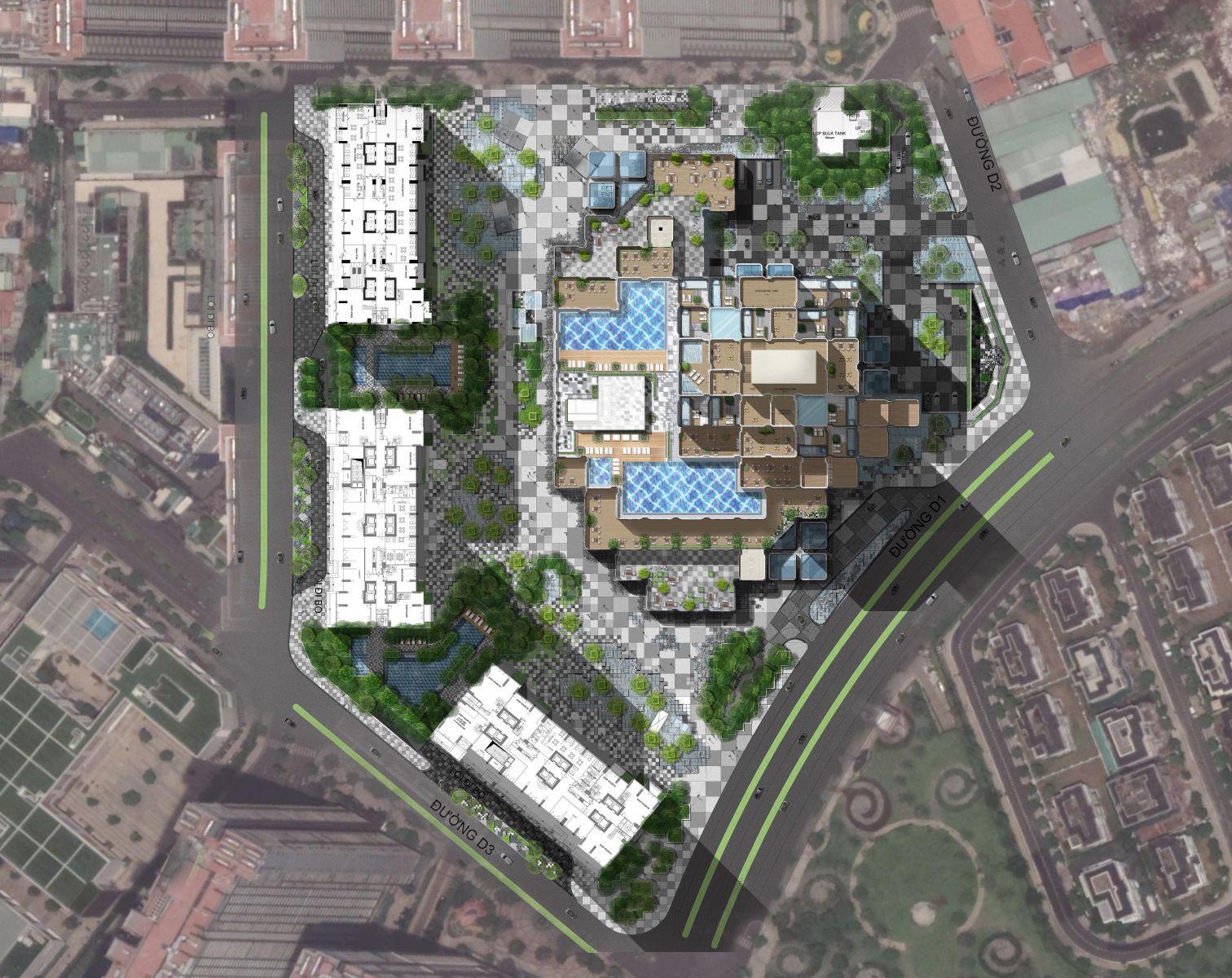 設計團隊是負責設計HCMC最大的公共空間的團隊,并且給這個項目賦予了它應有的商業和社會價值。公共領域作為鏈接行人的關鍵節點,連接公共交通系統、零售和周圍的住宅開發。該設計還提供一個有價值的和動態的公共空間,用來欣賞塔的發展規模和宏偉。