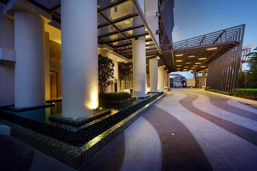 Twin Arkz的兩棟高樓底層的車道用瓷磚鋪成波紋,加上車道旁的灌木叢形成的綠色波浪,像是承載著方舟的大海。