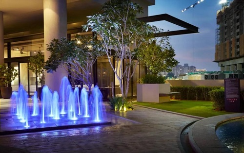 項目設計了一座前衛的無邊界泳池,里面鋪上夜光的瓷磚,與旁邊的淺水池和旱噴泉共同營造了寬廣的視覺效果。