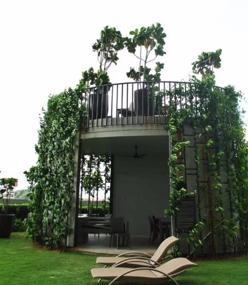 ●設計感強烈的涼亭四周爬滿攀藤綠植,與綠色草坪完美連接。