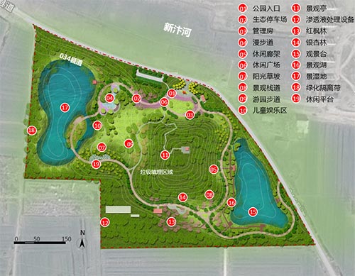 3 原垃圾場范圍以疏林草坪為主,不種大喬木,防止破壞底層防滲膜,泄漏有害物質以草皮地被全面覆綠,種植生長較慢的淺根系、小喬灌植物。應用刺槐、欒樹、白蠟、狗牙草、車軸草等抗污染性植物,改善生態條件。種植桂花、晚櫻、垂絲海棠等芳香花林清新空氣,遮掩異味。