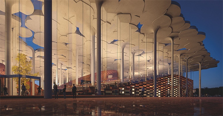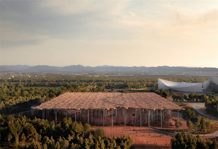 城市副中心圖書館是坐落于六環(huán)公園邊的“書山智庫”,又名“森林書苑”,其設計理念源于中國傳統(tǒng)文化符號“赤印”,屋頂?shù)臉錉罱ㄖY(jié)構(gòu)宛如森林傘蓋,以銀杏樹葉片為靈感來源,體現(xiàn)出圖書館傳承知識、傳播文化的功能定位。