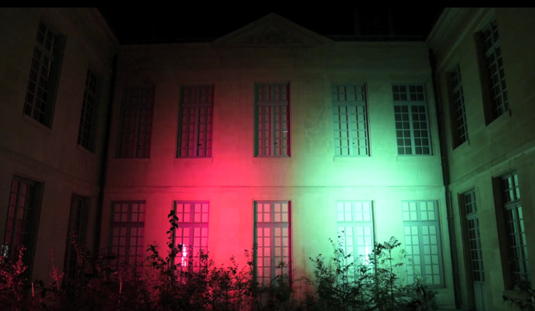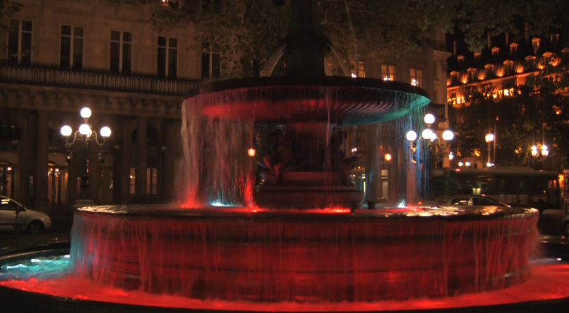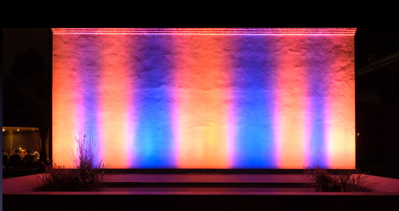 第二個(gè)作品的題目叫做持續(xù)的黃昏,是法國政府和文化部委托的一個(gè)項(xiàng)目,作品安裝在安德列馬爾羅廣場上,和廣場噴泉結(jié)合在一起,它的開啟時(shí)間從黃昏到第二天的黎明。這個(gè)作品的燈光有紅色、藍(lán)色和綠色三種顏色,因?yàn)楫?dāng)時(shí)的市長說他們夏日的黃昏經(jīng)常從紅色變成綠色,而藍(lán)色又正好是這兩個(gè)顏色的互補(bǔ)色。所以這個(gè)項(xiàng)目當(dāng)一邊有紅色的時(shí)候,另一邊就會是綠色或藍(lán)色的,這三個(gè)顏色能夠不斷地在巴黎中心地帶的瀑布上來回旋轉(zhuǎn)。在這個(gè)相對比較古老的地區(qū),結(jié)合周邊的環(huán)境設(shè)計(jì)了這樣一個(gè)作品,是比較成功的。