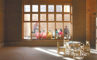 于是,校舍房屋借鑒當地傳統,采用1米厚的土坯墻,僅此一項可使冬季教室內氣溫平均提升2—3攝氏度;將常規屋面保溫擠塑板,替換為同等絕熱效能的草泥墊層,造價降低至少80%。最終,建成的小學校舍實現了全年近零能耗的生態效益,總造價也比當地具有同等抗震和保溫性能的常規磚混房屋減少1/3。