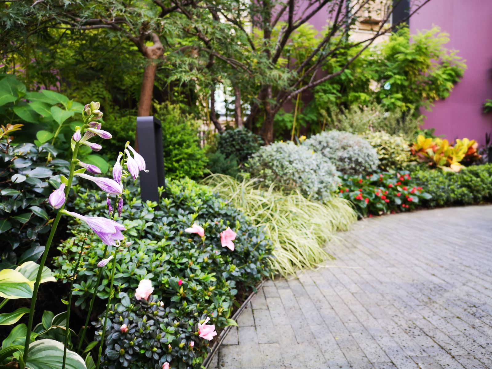 位于南京西路石門一路口的靜安區石南街心花園,利用色彩斑斕的歐洲模紋花壇式垂直綠墻和莫蘭迪色系景墻的組合設計,隔離場地變電房等市政設施,形成豐富的空間轉換,外部是以藝術化綠墻為背景的街角空間,內部則是淡雅精致的城市庭院。精致的小花境與特選的造型垂直梅、紅梅、紅楓、雞爪槭、羽毛楓分布在庭院內各處,日間青枝綠葉、繁花似錦,夜晚結合庭院燈光,又是另外一番樹影婆娑、恬靜高雅的景致。