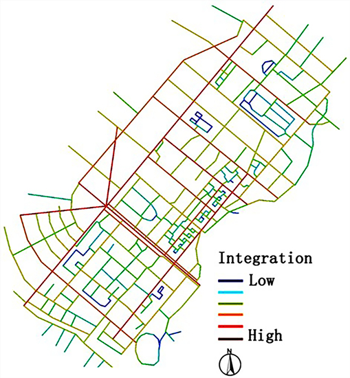花園街道轄區(qū)有歷史建筑保護(hù)街區(qū),其外有圍墻,運(yùn)用空間句法對(duì)其可視性分析,結(jié)果顯示:拆除歷史建筑保護(hù)街區(qū)的圍墻并對(duì)外部空間有效利用后,加強(qiáng)了居民區(qū)與購(gòu)物中心的聯(lián)系,打破了以往商業(yè)區(qū)主要對(duì)轄區(qū)以外民眾服務(wù)的現(xiàn)實(shí)狀況。花園小區(qū)、海城小區(qū)、繁榮小區(qū)的居民區(qū)對(duì)閑置區(qū)域呈半包圍結(jié)構(gòu)。拆除圍墻不僅實(shí)現(xiàn)了小區(qū)之間視線的連通,也實(shí)現(xiàn)了各小區(qū)之間的空間通達(dá)。這說(shuō)明提高外部空間通達(dá)性將對(duì)轄區(qū)北側(cè)花園小區(qū)及區(qū)域周邊空間活力產(chǎn)生積極的影響。