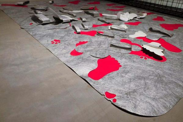 展覽現場,作品《展覽館》將拖鞋、地毯與場景空間相結合。