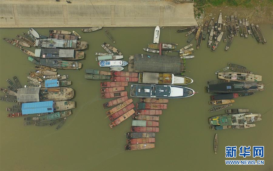 在湖南常德漢壽縣蔣家嘴鎮(zhèn),待回收的鐵漁船停靠在洞庭湖邊(2019年12月17日攝,無人機照片)。新華社記者 薛宇舸 攝