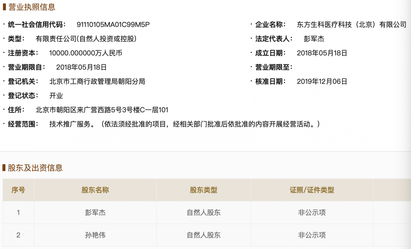 目前,東方生科的大股東是彭軍杰,持股比例90%,認(rèn)繳出資額9000萬(wàn)元,二股東為孫艷偉,持股比例10%,認(rèn)繳出資額1000萬(wàn)元。