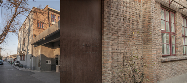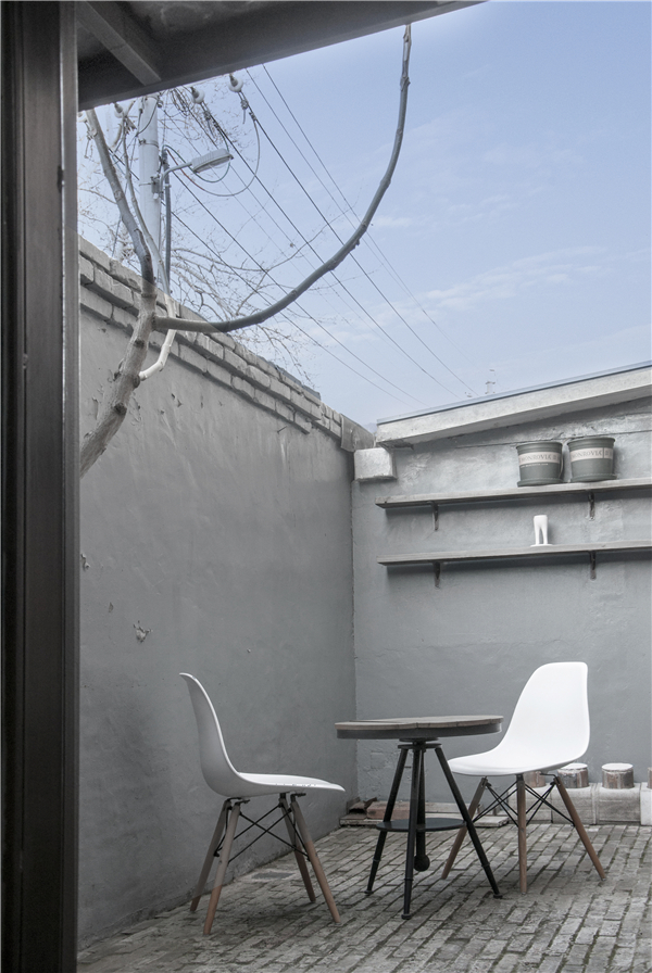 The kitchen space, originally a material storage room of the copper wire factory, sandwiched between the building's northern exterior wall and a lane just two meters apart, was an addition to the main building. Strategically, we retained half of the added part and partially opened the interior partition to form an open kitchen, while the other half was removed to form a small outdoor yard. The use of weatherproof steel plates and fair-faced concrete throughout the kitchen area evokes a historical impression of old industrial buildings. Two large skylights are added to the refurbished roof to compensate daylight on the north side. Steel plates are also installed on the windowsill connecting the interior and the kitchen, making it a temporary drinking bar. In addition, we gave up the conventional prefabricated integral kitchen, with the originally designed polygonal hand washing sinks balancing functionality with style. In the yard created after removing the roof, the ground is paved with red bricks like the facade of the building and planted with discarded phoenix tree branches from the hutong. Designers can rest here after work and feel the hustle and bustle of daily life in the alley. It is like a connector between the old industrial building and the hutong.