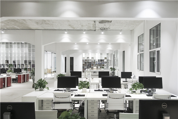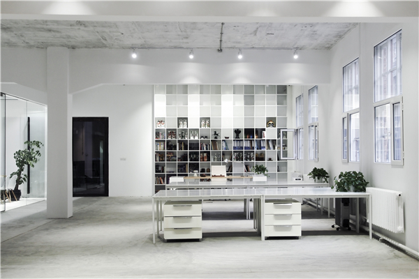 The open office design mainly aims to preserve the traces of industrial architecture and avoid excessive colors and decorations. In this information overload age, people, actively or passively, receive excess information through various channels every day. A calm and free space may better give designers the soil to cultivate inspiration. The floor of open office area is recovered by self-leveling concrete. In addition to the simple treatment of existing structural columns, there is no unnecessary decoration. The original mottled texture of the roof is deliberately retained, which naturally highlights the original industrial attributes of the building. The full-height bookshelves and full-display cork walls guide the focus of sight, and the open workbench at the end of the corridor provides space for designers to discuss and make models freely.