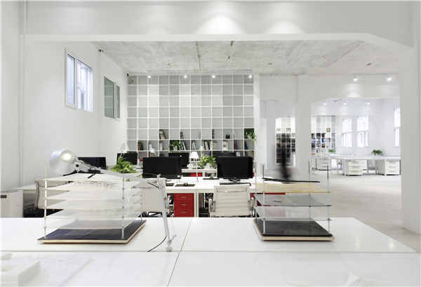 開放辦公區(qū)的設(shè)計手法以保留本身工業(yè)建筑痕跡為主要目標,減少過多色彩和裝飾。在當前這個多信息時代,人們每天通過各種渠道主動或被動地接受了過剩性信息,相形之下,一個平靜和自由的空間可能會更好地給予設(shè)計師培育靈感的土壤。開放辦公區(qū)地面采用混凝土自流平,除了對現(xiàn)有結(jié)構(gòu)柱進行簡單處理外不做冗余裝飾,刻意保留的屋頂原有斑駁紋理,自然彰顯出該建筑原有的工業(yè)屬性。兩個通高書架和整面軟木展示墻引導(dǎo)了人視線的焦點,置于過道盡端的開放工作臺為設(shè)計師自由討論與制作模型提供了空間。