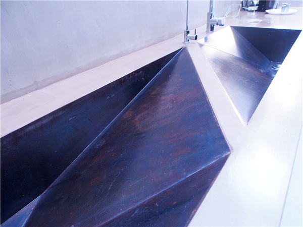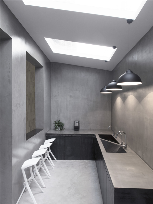 廚房空間原來是銅絲廠的材料堆放室,夾在建筑北側(cè)外墻和僅僅兩米之隔的胡同之間,是一個附屬于主建筑之外的現(xiàn)狀加建。設(shè)計策略上保留了一半加建的部分,并將室內(nèi)隔墻局部性打開形成開放式廚房,另一半拆除后形成一個小型的室外院落。整個廚房區(qū)域在材料上使用耐候鋼板和清水混凝土,喚起人們對舊工業(yè)建筑的歷史印象。翻新的屋頂上增設(shè)有兩個大型天窗以補償北側(cè)采光不足,連通室內(nèi)和廚房的窗臺上也設(shè)置有鋼板,成為大家臨時小飲的吧臺。此外,放棄了常規(guī)的預(yù)制整體廚房,原創(chuàng)設(shè)計的多邊形洗手池在功能和造型之間找到了平衡。在去除屋頂后創(chuàng)造出來的小院地面鋪上了和建筑外表皮一樣的紅磚,并栽種了來自胡同修剪廢棄的梧桐樹枝,設(shè)計師在工作之余可以在這里休憩身心并感受到胡同里飄來的市井煙火與民生喧囂,宛如一個舊工業(yè)建筑和胡同間對話的連通器。