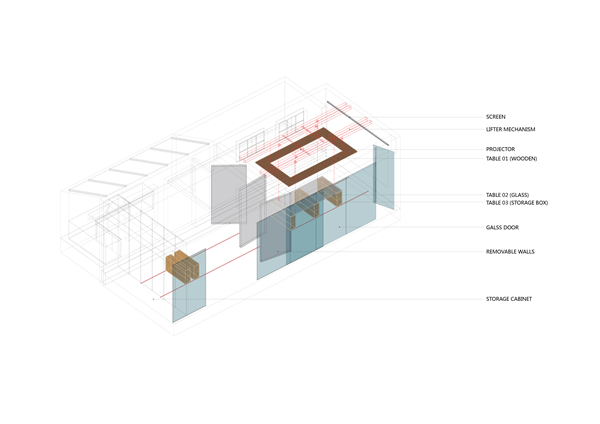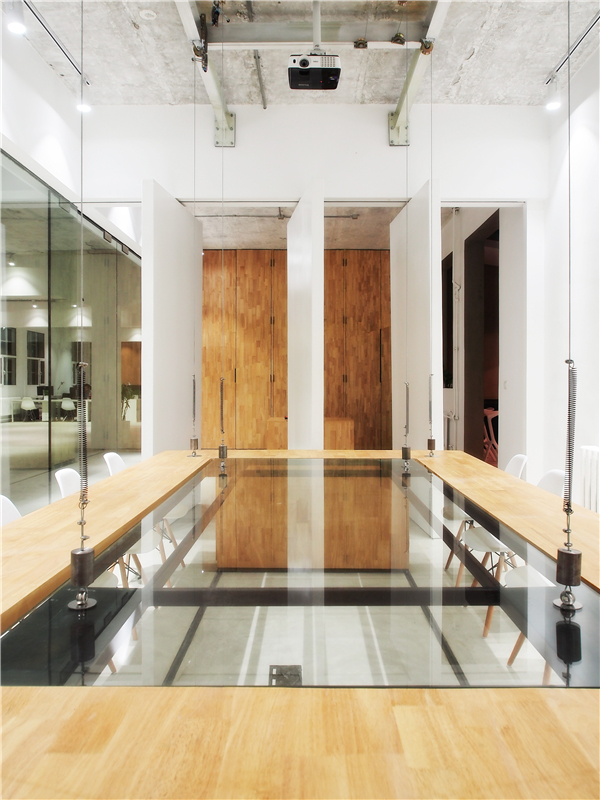 The tempered glass table top in the middle mainly carries the daily routine of the design studio such as drawing, group discussion and model making. The office function is also the most common usage of this space.