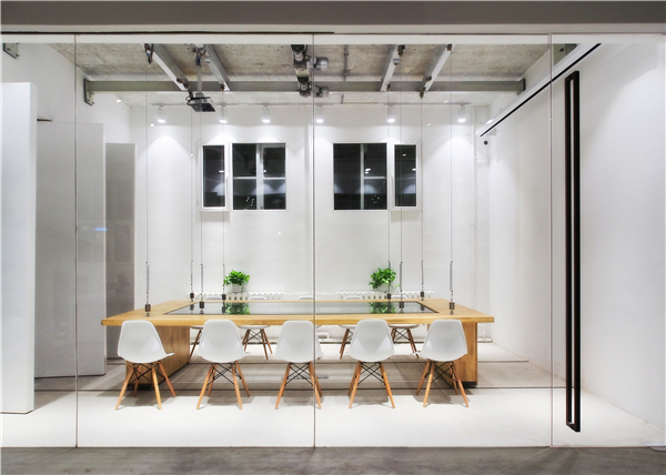 中間的鋼化玻璃桌面主要承載了畫圖、小組討論、模型制作等核心的設(shè)計工作室日常,這一辦公性功能也是該空間最常用的使用形態(tài)。