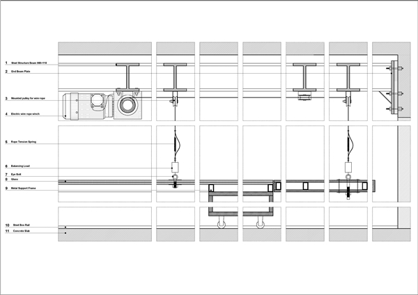 在“三重桌”的機械設(shè)計上,建筑師與工程師緊密合作。三重桌的整個機械裝置固定在一組井字形的鋼梁上,主鋼梁通過牛腿固定在建筑結(jié)構(gòu)梁上。兩個功率為1.2千瓦的電動鋼絲提升機為裝置提供動力,每部提升機對應(yīng)4個特殊位置的滑輪,精心設(shè)計的滑輪組可以獨立引導(dǎo)兩重桌面進行升降。為最小化提升機拉繩帶來的視覺影響,在嘗試了多種材料后選擇了直徑僅為兩毫米的鍍鋅鋼絲繩作為牽引材料。此外,如何保持鋼絲的拉力也是一個關(guān)鍵問題。鋼絲繩具有強度高、韌性好、直徑小的優(yōu)勢,但因材料自身存在的內(nèi)部張力,在缺乏外部壓力的情況下極易彈出提升機滾輪。最終設(shè)計了一套利用彈簧和重錘的相互作用以持續(xù)保持鋼絲繩拉力的特殊裝置來解決這一問題,并將其和隱藏在桌面下的可拆卸裝置結(jié)合,使“三重桌”的機械裝置達到了可隨時拆卸的效果,并且最小化了對使用者的視覺影響。