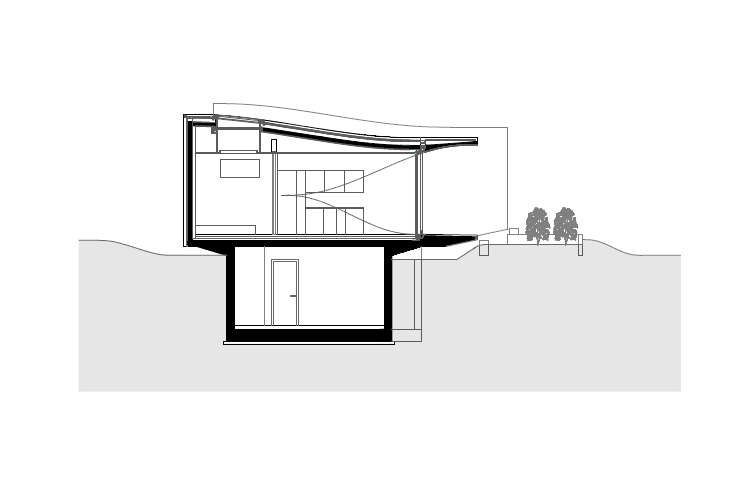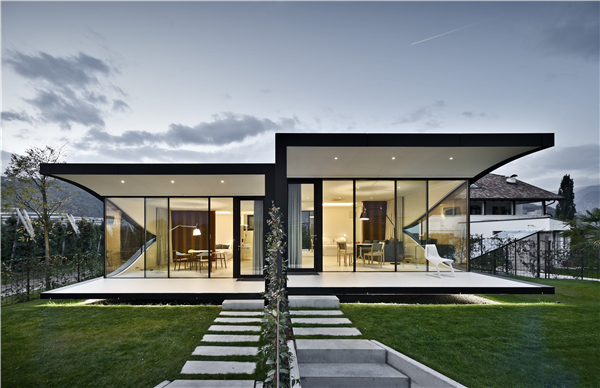 兩個單元的基礎(chǔ)都高于地面,除了提供更好的視野,還帶來了輕盈的感覺。建筑朝東開放,巨大的玻璃立面以曲線線條融入黑色鋁殼中。西側(cè)立面的鏡面玻璃與客戶的花園相鄰,捕捉周圍的全景,同時使單元房幾乎不可見。鏡面玻璃使用了UV涂料,防止鳥類碰撞。