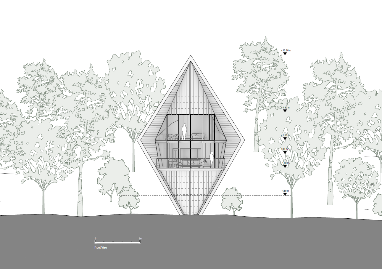 The project Tree Houses is located in West Virginia, United States. The single units create a new experience to live in the woods with a maximum connection with nature. The geometry with its sharp steep roof is inspired by the surrounding maple, poplar and oak trees and will be made of local wood.