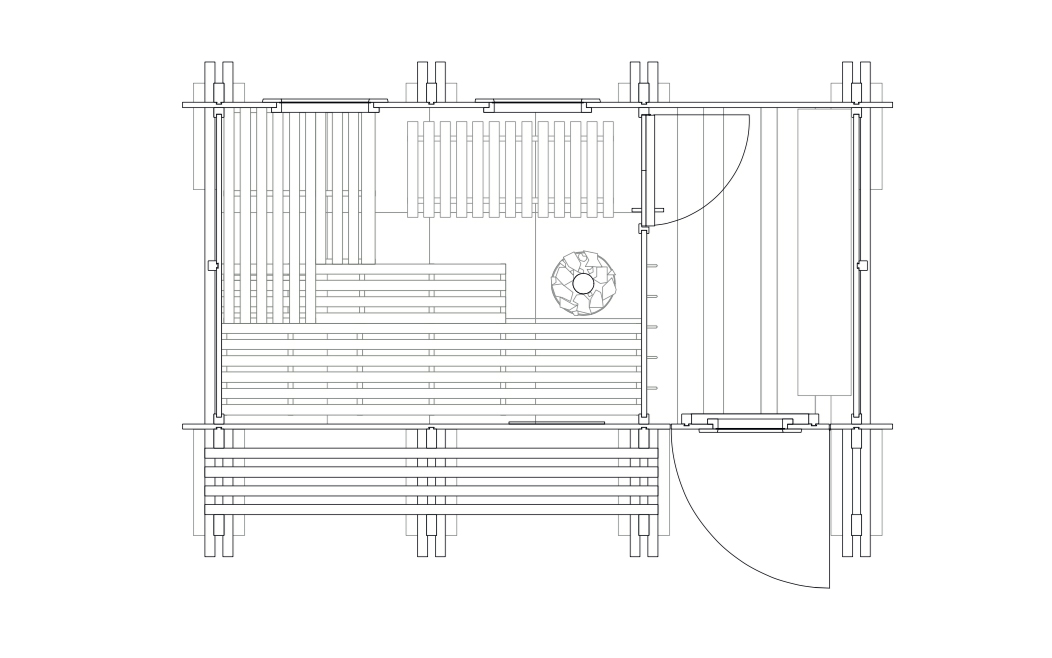 The rectangular floor plan is divided into an entrance area and the sauna room in a ratio of 1:2. The integrated seating and storage spaces on the outer structure offer additional qualities. An inviting entrance door with a small window leads to the changing room including hangers and a bench. A lower door connects the entrance room to the sauna, the low doorframe prevents hot air from escaping. This room is illuminated by two fixed windows and can be ventilated by the help of two ventilation flaps. One flap is mounted low behind the oven for sufficient oxygen supply and the other one is located on the opposite wall below the ceiling to regulate the exhaust air. The floor is made out of concrete panels which on one hand weigh the whole building down and also enable the water to seep through the floor. The L-shaped bench allows the seating on two different levels and includes the granite filled wooden stove. Furthermore, a stainless-steel pipe leads the smoke through the side wall to the outside.