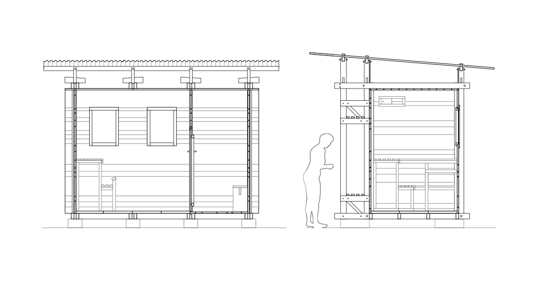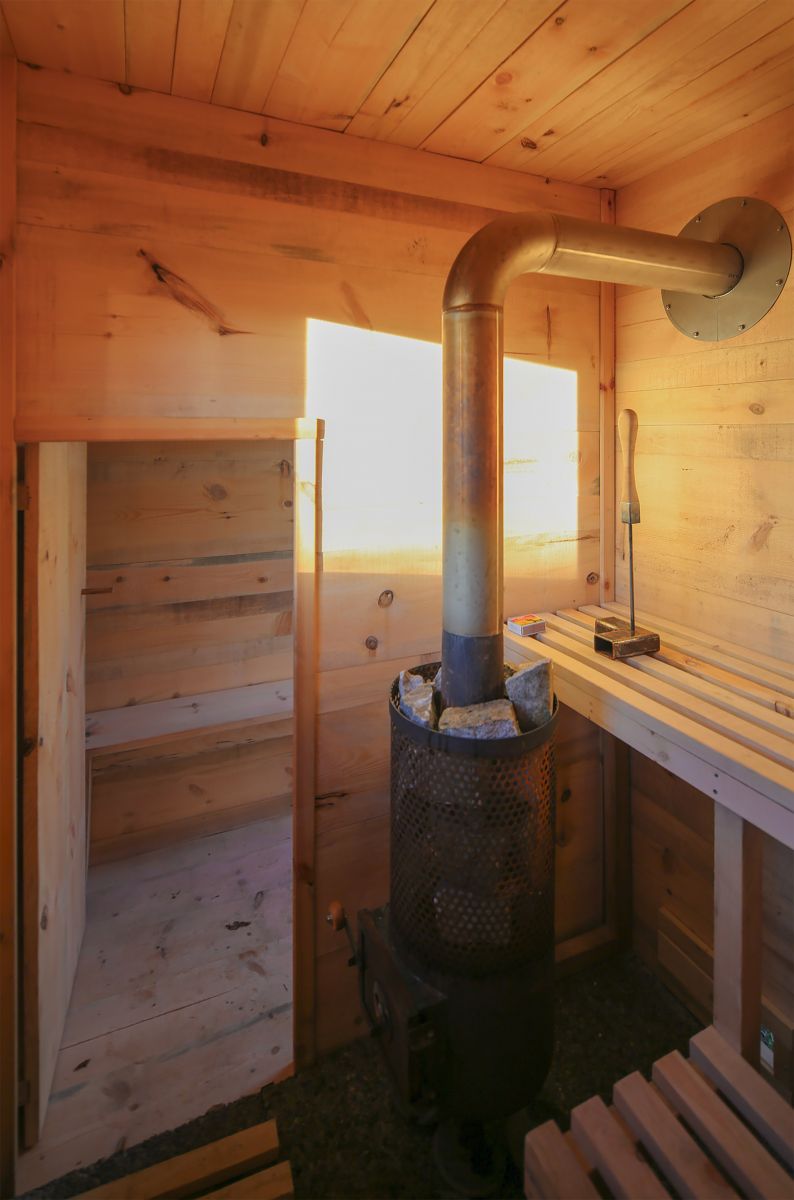 平面圖按照1:2比例分為入口和桑拿室。座椅和儲(chǔ)物空間設(shè)置在了桑拿房外部。更衣室設(shè)有小窗,屋內(nèi)含衣架和長(zhǎng)凳,另外較低的門進(jìn)入是桑拿房,這個(gè)高度是防止熱氣外散。房間采光來自兩個(gè)窗戶,借助兩個(gè)通風(fēng)閥來流通空氣。地板由混凝土板制成,可以整體下壓這個(gè)木屋,另外還可以滲水,L形長(zhǎng)椅設(shè)置成不同的高度,木爐配有花崗巖填充,不銹鋼管將煙氣引到外部。