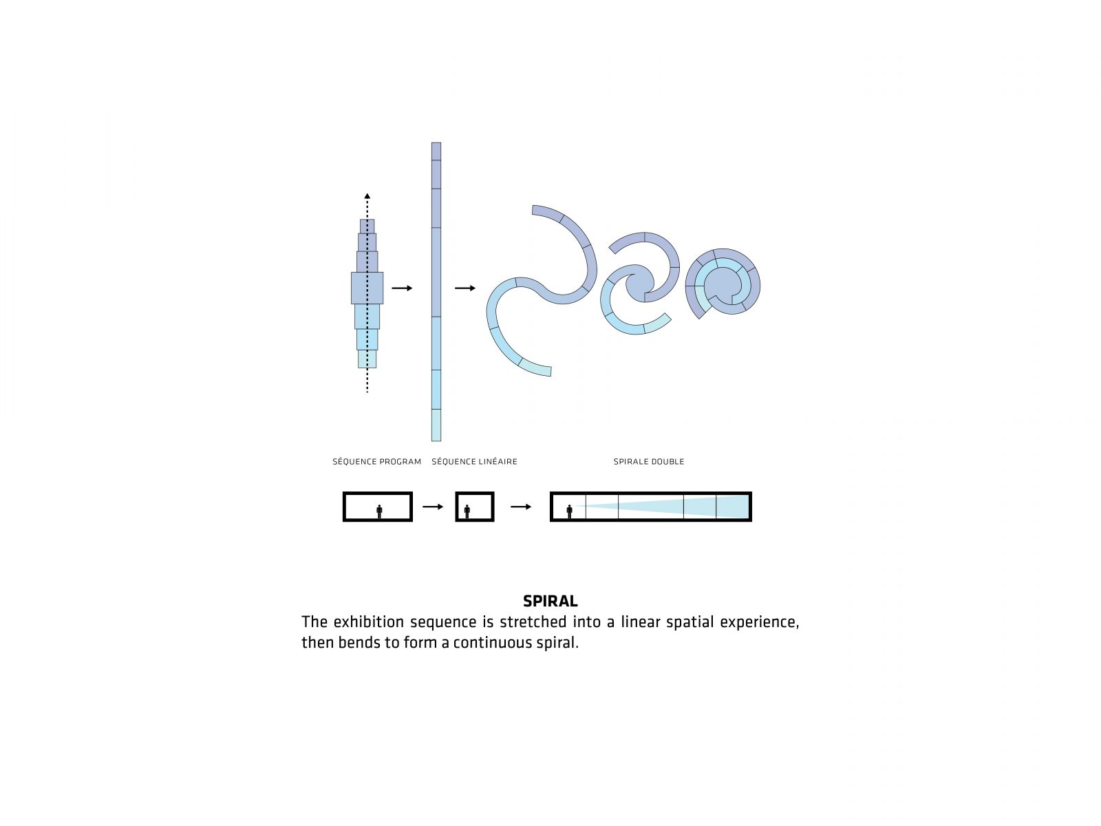 展覽順序被拉伸成線性的空間體驗,彎曲以形成連續(xù)的螺旋。