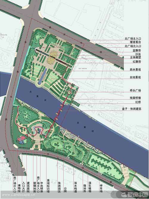 “差異”在設(shè)計(jì)中主要通過(guò)植物、色彩、形態(tài)的區(qū)分來(lái)體現(xiàn)。以古黃河為界,在河流兩岸分別種植具有南北不同特征的植物,用色彩中的紅與藍(lán)分別代表氣候上的熱帶與寒帶,用形態(tài)中的柔與剛分別代表南北文化中的柔美與爽直。而“融合”在設(shè)計(jì)中主要通過(guò)活動(dòng)的連續(xù)性和各種功能的整合加以實(shí)現(xiàn)。