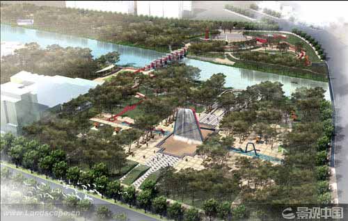 一環(huán):主要由標(biāo)志園的主體雕塑、紅橋和步道連接成一個(gè)連續(xù)的步行空間網(wǎng)絡(luò)。通過(guò)這個(gè)連續(xù)的步行空間網(wǎng)絡(luò)聯(lián)系南北岸的公共空間,使之整合起來(lái)更富有活力和豐富性。