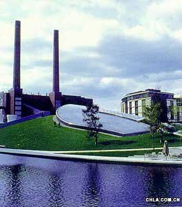 汽車城主題公園的景觀設計由漢堡WES景觀設計事務所承擔,設計師充分運用現狀自然條件,配合建筑師,創作以城市廣場、人工湖和島嶼景觀為特點的主題公園。公園看上去更像是高爾夫球場,有水池,有丘陵。將工業與園林景觀結合起來,體現了歐洲重視環保和生態的意識,以及自然、人、技術的和諧,這也是當今社會發展的趨勢。所有展廳都盡量利用自然光和通風,主要建筑沒有空調。景觀設計師在公園南部主要入口處,以寬闊的城市廣場突出長方形大廳的體量;在大廳以北與人工湖之間的廣場上,行列種植落葉喬木形成林蔭廣場,并在臨近人工湖一面設親水平臺。公園的中心為人工湖和島嶼景區,景觀設計師引入運河之水,形成1.6公頃人工湖,在湖中央設有水站和過濾裝置,利用人工湖與運河之間的高差,形成40米寬瀑布景觀,構成運河與人工湖之間水循環。挖湖工程中景觀設計師巧妙利用土石方平衡,進行地形改造形成頗為自然的島嶼景觀,而這些島嶼豎向上的曲線形狀又恰似汽車城會標造型,令人叫絕。