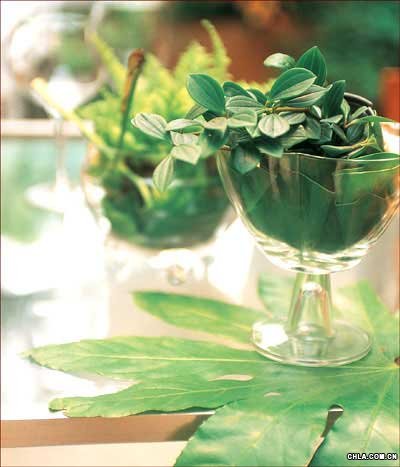利用透明玻璃杯養些喜陰的蕨類或綠葉植物,放在向北的廚房也能很好地生長。整齊地擺放在窗臺上會給廚房帶來一份活力和生機。