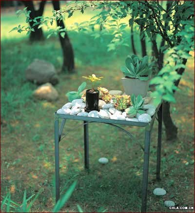 在鐵架上搭一塊木板,放幾個小花盆,堆滿石子,再種幾棵耐干旱性植物,就成了一個具有沙漠風情的迷你花園。耐干旱性植物有豐富的水分,十天、半個月澆一次水也能很好地生長