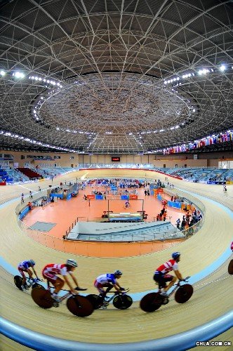 2007年12月6日,參加“好運北京”2007--2008國際自盟場地自行車世界杯賽的各國參賽選手在北京老山自行車館進行賽前訓練。老山自行車館是北京奧運會的改擴建場館。其巨大的“飛碟”形屋頂凌駕于南北貫穿的群芳平臺之上,氣勢恢弘、場面壯觀。老山自行車館擁有國內首例寬達11米的木質賽道,這將使老山自行車館躋身國際一流的室內自行車場館之列。新華社發