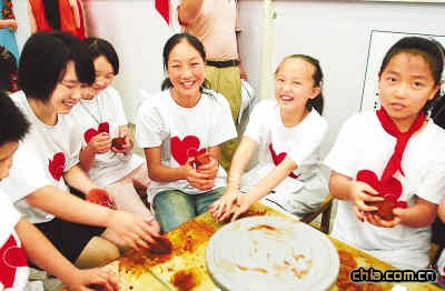 v7月8日,由四川災區和北京的孩子組成的“愛心傳遞”夏令營在北京市中國兒童少年基金會地子自然體驗基地開營。孩子們還將參觀奧運場館、中國科技館等。圖為孩子們一起體驗陶藝、扎染。