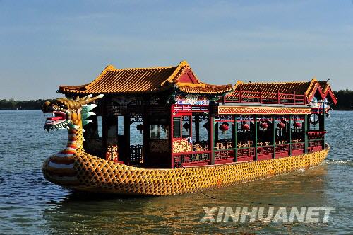 這是北京頤和園昆明湖上的一艘仿古游船(7月12日攝)。 新華社記者 杜華舉 攝