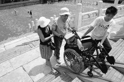 為迎接奧運會及殘奧會,方便殘疾游客,北京天壇公園首次在祈年殿東側臺階搭建無障礙設施。圖為7月15日,一位有腿疾的外國游客在別人的幫助下登上無障礙臺階。  卓恩森攝