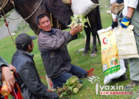 牧民向驢友推銷雪蓮,旁邊馬匹馱著的尿素袋中裝的都是剛采挖的野生雪蓮