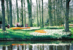 庫肯霍夫公園內,色彩繽紛的花卉與波光粼粼的湖水組成一幅美麗的圖畫。