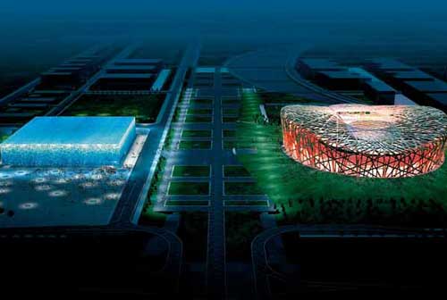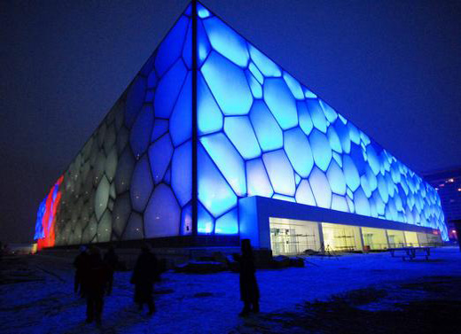 已經投入使用的“水立方”如同一塊湖藍色的水晶,它的燈飾效果強調更加科學的照明方式。光與影的巧妙組合,使之整體面貌更加曼妙多姿。日光下的淡藍,給人以賞心悅目的睥美感;燈光籠罩中,避免了立體感上的平淡無奇,而變幻多彩的影調,又創造出輕快、活潑和明朗的氣氛。“鳥巢”與“水立方”的紅、藍輝映,加之奧運村主墻面'黑、白、灰'的水墨畫效果,中國傳統色彩在奧運建筑中的運用達到了極致。