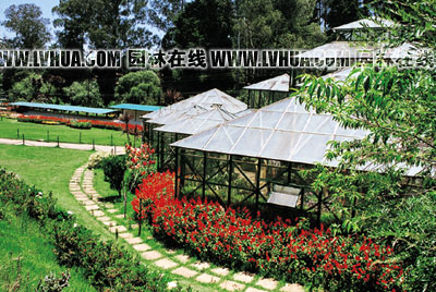 為了通過引人注目的植物組合配置形式全年展示多姿多彩的植物品種,于1912年建成了展覽溫室。今天,人們在這里能欣賞到各種溫室花卉和珍奇花草,如蒲包花、新幾內亞鳳仙和口紅花等。緊鄰的還有巖石園,200多種來自印度山地的高山植物被科學地布置在如同野外生境般的環境中,襯托著區域的種植背景,既有很高的欣賞性,又有身臨野境般的神奇感覺。沼澤花園位于展覽溫室的東邊,這里為垂柳、姜花、海芋等喜濕的植物創造了適宜的生境。低地花園緊鄰沼澤花園,既有噴泉花壇、人工避暑草房,也有茂盛的樹蕨形成的自然生境。臨近的山坡是觀賞低地花園的最佳地點。