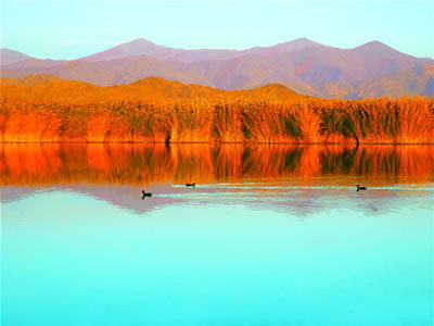 草原澤國--可可蘇里 進(jìn)入景區(qū)23公里處,便是可可蘇里,又稱野鴨湖,湖面面積2677畝,平均水深2米,湖中有大小浮島20多個,水生植物豐富。蘆葦浮在水面上,隨風(fēng)漂游,風(fēng)一場景一場,湖面景色隨蘆葦?shù)淖儎佣兓。每年夏秋季?jié),成千上萬的野鴨、水雞、紅雁云集在此繁衍生息。野鴨湖既有西湖的精致秀美,又有白洋淀的葦蕩迷宮,一派“沙鷗翔集”、“魚翔淺底”的水鄉(xiāng)澤國美景。遠(yuǎn)處高大的裸露山體,褶皺溝壑依稀可見,湖對岸萬余畝開闊平坦的草原上散布著悠閑的群群牛羊,踏花覓草,恬靜安逸,令人感嘆大自然何以造就如此精致完美的山水畫卷。