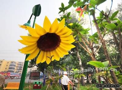 8月12日,新穎的葵花形路燈安裝在桂花樹身旁。為支持我市創建國家園林城市國家衛生城市工作,今年5月,神馬集團投資20萬元,在市區建設路與勞動路交叉口規劃建設了一個占地1550平方米的小游園——桂花園,并在這里安裝了6盞葵花路燈、2盞花蕊燈,投入使用兩個月來不斷贏得市民夸贊:“遠看向日葵,近看是路燈,構思真巧妙!
