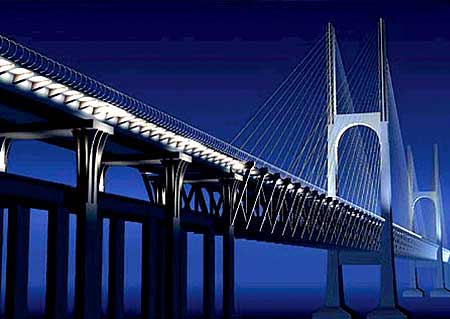 武漢第六座長江大橋。正橋全長4657米。公路橋為雙向6車道,設計時速80公里/小時,主跨504米,主塔高189米,是世界上跨度最大的公鐵兩用斜拉橋,其中鐵路橋可并排跑四列火車(兩條客運線和兩條貨運線)。該橋因其獨特的設計和特有的施工難度,被橋梁界譽為跨江橋的里程碑。 總投資:30多億元