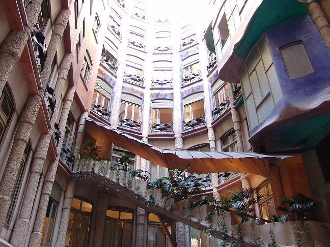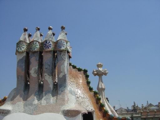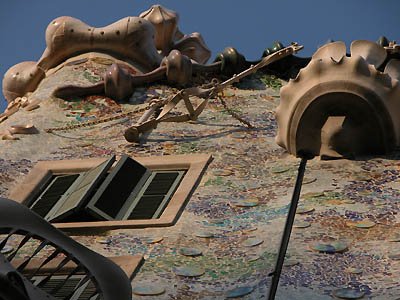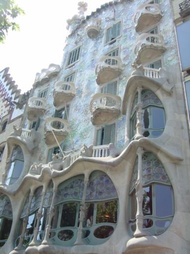 巴特羅之家--Casa Batllo 這是對一個(gè)舊建筑的“高迪化”。 高迪在這里表現(xiàn)了他對于色彩和外墻裝飾的理解,也表現(xiàn)了他豐富的想象力和對于不同材料和顏色的駕馭。 龍形的屋頂下是骨骼狀的陽臺(tái)。飾件都有圓弧,都是流動(dòng)的。