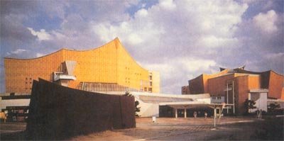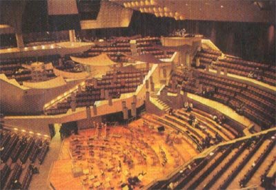 柏林愛樂音樂廳 柏林愛樂音樂廳的前廳安置在觀眾廳的正下面,由于觀眾廳的底面如同一個大鍋底,其下的前廳的空間高矮不一,其中還布置著許多柱子、杰梯和進口,因而這個音樂廳的前廳的空間形狀極其復雜,路線非常曲折。初次來此的人會產生撲朔迷離、摸不清門路而豐富誘人的印象。及至進入觀眾廳內,看到的又是如同山口袋中葡萄園似的景象。聽眾席化整為零,分為一小塊一小塊的“哇田”似的小區,它們用矮墻分開,高低錯落,方向不一,但都朝向位于大廳中間的演奏區。由于化整為零,一般大觀眾廳中常有的誠大的大尺度被化解了,確實呈現出親切]隨和、輕松、細開展巧、瀟灑的氣氛。