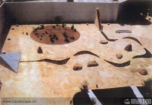 在水資源缺乏的地區,象征、抽象、虛擬的水景(圖7)也是一個很好的解決辦法。此處的虛的水景是相對于實際水體而言的,它是一種意向形的水景,是用具有地域特征的造園要素如石塊、沙粒、野草等仿照大自然中自然水體的形狀而成的(圖8)。這樣的水景對于嚴重缺水地區水景的營建具有特殊的意義,同時這樣的水景更易于帶給人更多的思考、更多的體驗。這也許是真實水景所無法比擬的,因為真實的水景往往只能帶給人們一種視覺上的滿足和膚淺的體驗。