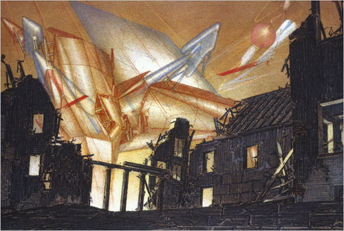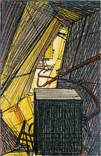 這一構(gòu)想在他1993年因受波黑戰(zhàn)爭的刺激而創(chuàng)作的一系列圖稿中得到了極端體現(xiàn)。受科幻連環(huán)畫的啟發(fā),這些手稿中遍布著扭曲的電纜線、崩潰的建筑物以及飛濺的鋼筋碎片。這些草圖似乎是對(duì)現(xiàn)代主義者對(duì)于未來烏托邦世界的信仰的一次嘲弄。它們黑暗憂郁的氣氛暗示了一個(gè)處于無窮盡生存掙扎中的世界。