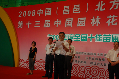今天上午九時,第十三屆中國園林花木信息交流會暨2008中國(昌邑)北方綠化苗木博覽會在山東昌邑市綠博園勝利召開。展會由中國花卉報社、山東林業局、山東市濰坊市人民政府、山東省外國專家局主辦,山東省濰坊市人民政府、濰坊金絲達實業有限公司承辦。開幕式上,中國花卉報社周金田社長向“2008年度全國十佳苗圃”獲得者頒發了獎牌。