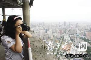 昨天上午,記者來(lái)到位于鼓樓廣場(chǎng)北側(cè)的紫峰大廈施工現(xiàn)場(chǎng),由于還在施工階段,記者只能通過(guò)運(yùn)送建筑材料的升降機(jī)從1樓往觀光平臺(tái)駛?cè)ィ捎谏禉C(jī)四周是用鐵絲網(wǎng)焊接起來(lái)的,起初還沒(méi)有感覺(jué),隨著升降機(jī)的抬升,離地面越來(lái)越遠(yuǎn),四周高樓的樓頂也漸漸地被“踩”在了腳下,此時(shí)心里產(chǎn)生恐懼感,一動(dòng)不動(dòng)地站在原地,生怕自己將鐵絲網(wǎng)弄壞了掉下去……72層到了,隨著升降機(jī)的停駛,記者艱難地邁出了腳步到達(dá)了72層。樓太高了,看玄武湖也就是一個(gè)洗腳盆那么大;看紫金山?我們這樓才可以真正和它“平視”。