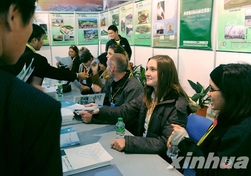 幾名客商(左)在一家園林公司的展臺前進行業務交談